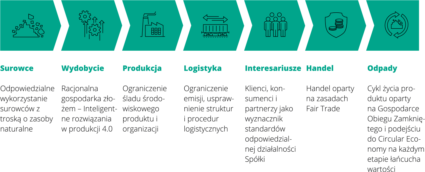 KGHM Polska Miedź S.A. myśląc o implementacji zrównoważonego rozwoju w organizacji, dąży do wcielania idei na każdym etapie łańcucha wartości. KGHM Polska Miedź S.A. charakteryzuje unikalny, nie spotykany wśród innych spółek z branży surowcowej, wysoce zintegrowany łańcuch technologiczny. Spółka we własnym zakresie realizuje zadania od eksploracji, poszukiwania i pozyskiwania surowców przez ich wydobycie, produkcję, transport, docieranie do odbiorców i interesariuszy a kończąc na odpowiedzialnym gospodarowaniu odpadami, tak aby możliwie ograniczać swój negatywny wpływ na otoczenie.