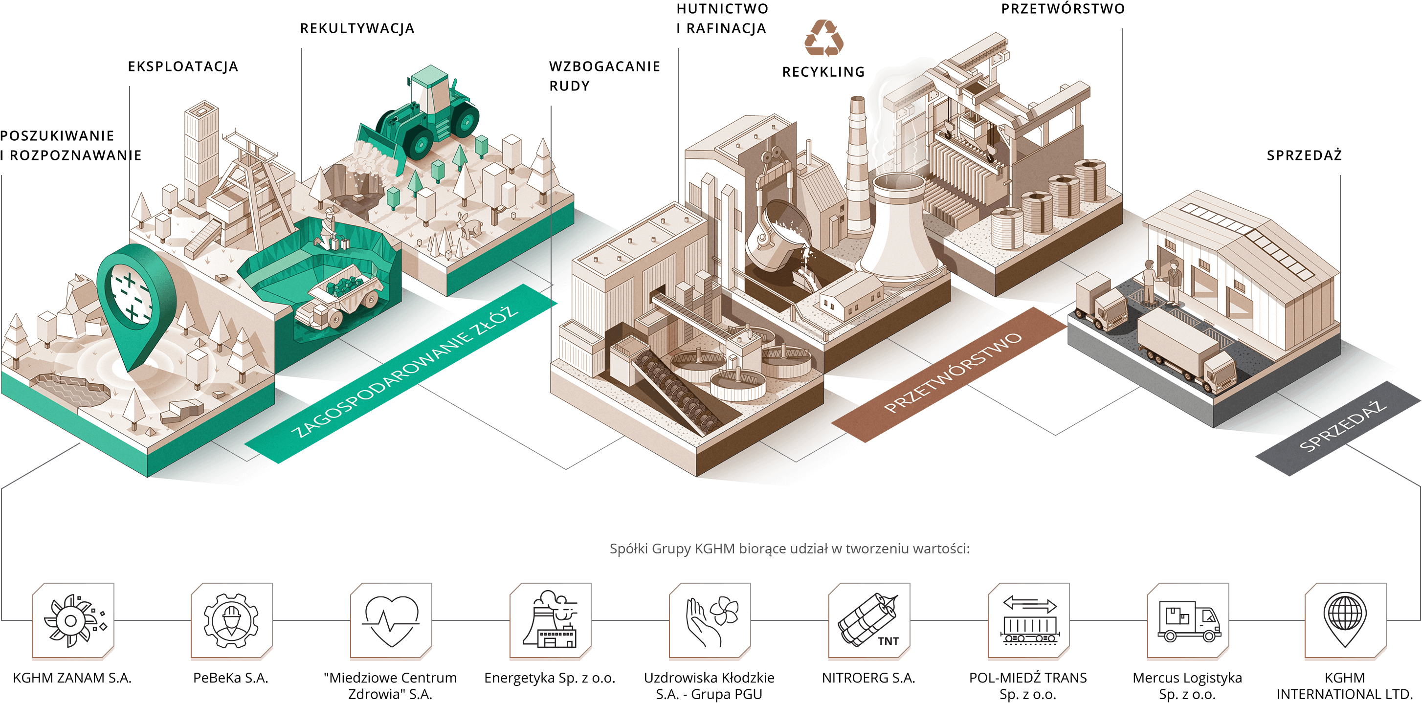 Grupa KGHM Polska Miedź S.A. jest globalną oraz innowacyjną organizacją, która prowadzi zaawansowaną technologicznie działalność poszukiwawczo-wydobywczą oraz hutniczą i posiada geograficznie dywersyfikowane portfolio projektów górniczych. Model biznesowy KGHM podzielony jest na 7 obszarów, poprzez które Grupa zapewnia pełny łańcuch tworzenia wartości, od eksploracji po sprzedaż gotowych produktów.