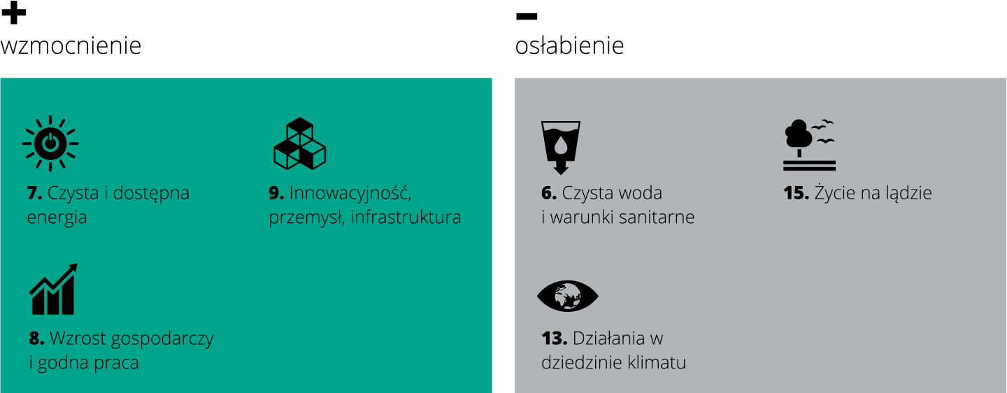 W oparciu o dogłębną analizę Agendy 2030, Spółka podejmuje działania służące zwiększeniu pozytywnego wpływu KGHM Polska Miedź S.A. w zakresie realizacji celów 07-09, a także osłabieniu negatywnego wpływu w przypadku celów 06, 13 i 15, tak by jak najlepiej realizować przedstawione na poniższym rysunku elementy zrównoważonego rozwoju w górnictwie: