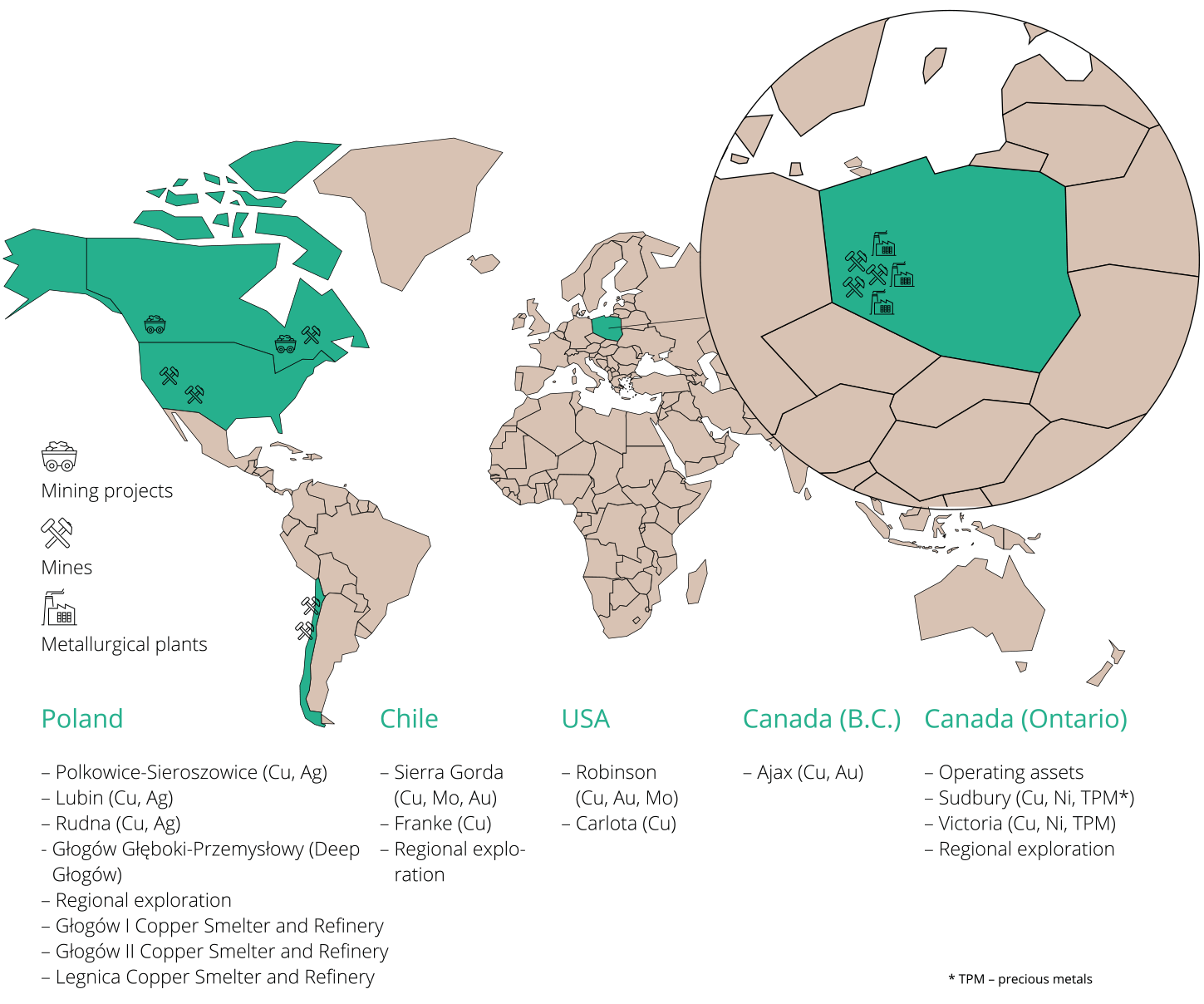 The KGHM Polska Miedź S.A. Group holds geographically diversified mining assets (mines with copper, silver, molybdenum, nickel and other metals) located in Poland, the USA, Chile and Canada.