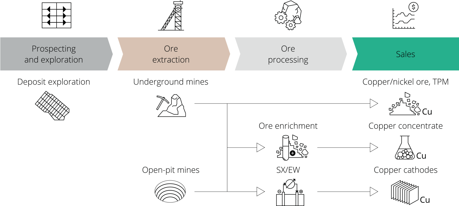 The core business of the KGHM INTERNATIONAL LTD. Group of companies is the mined production of metals, such as copper, nickel, gold, platinum and palladium, from both open-pit and underground mines, as well as advancement of mining and exploration projects. The drawing above shows a simplified flowchart of the core business of the KGHM INTERNATIONAL LTD. Group.