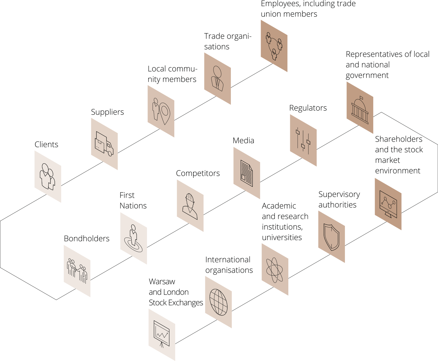 The Company was also a permanent component of the RESPECT Index, from 19 November 2009 until 1 January 2020 when it ceased to be calculated and published. KGHM Polska Miedź S.A. is also included in the WIG-Mining sector index. Moreover, KGHM Polska Miedź S.A. forms part of the FTSE4Good Index Series, which is part of the group of ethical investment indicators, reflecting criteria of corporate social responsibility and ESG risk management.