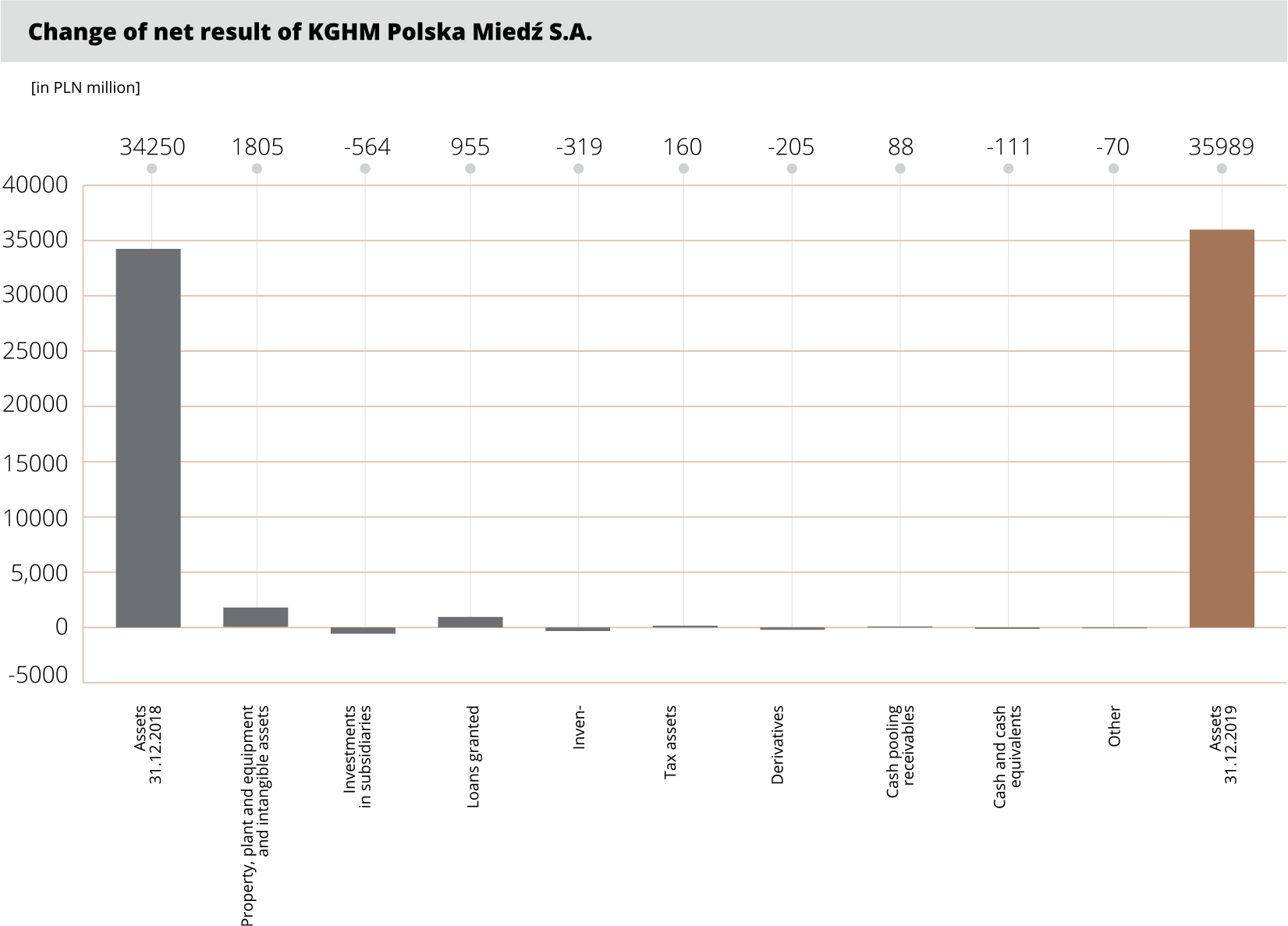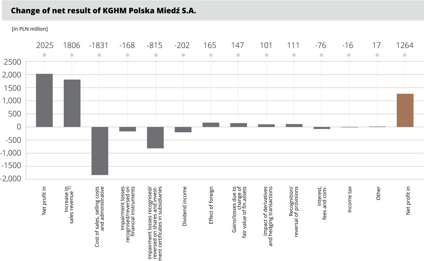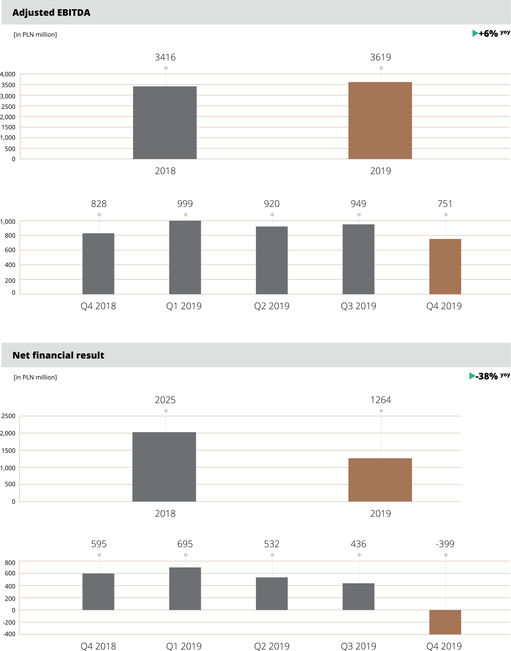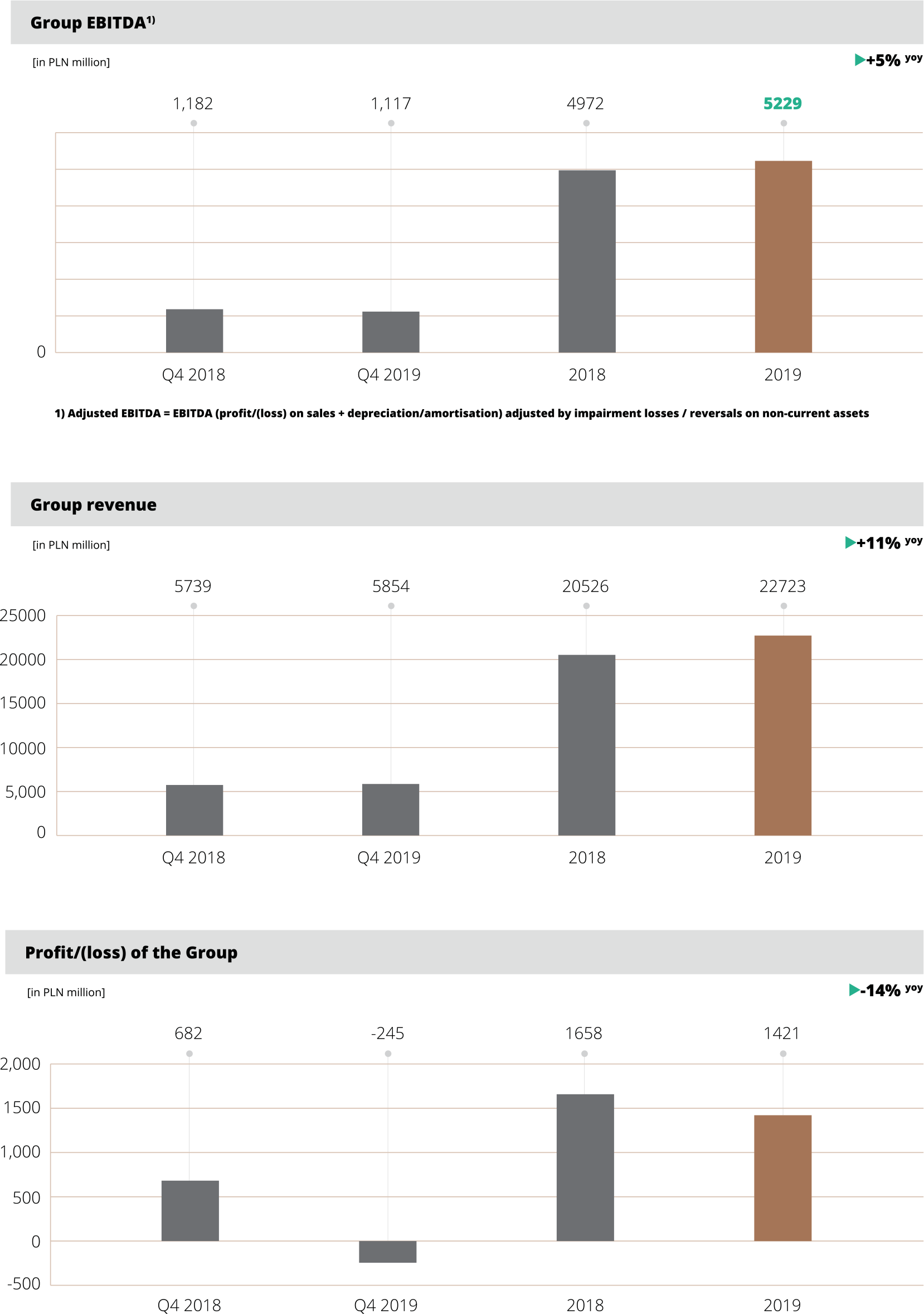 Revenues of the KGHM Group in 2019 were PLN 2,197 million higher (+11%) than in the same period of the previous year; the revenues of KGHM Polska Miedź S.A. increased by PLN 1,926 million. The increase was driven mainly by the increased volume of copper (+8%) and silver (+13%) sales, but also a more favourable exchange rate coupled with lower prices of copper. At the Group EBITDA level, contributions included higher operating results of KGHM Polska Miedź S.A. (+PLN 203 million, +6%), Sierra Gorda (+PLN 27 million, +4%) and other Group companies in Poland (PLN 40 million, +20%). The Group posted a consolidated net result of PLN 1,421 million.