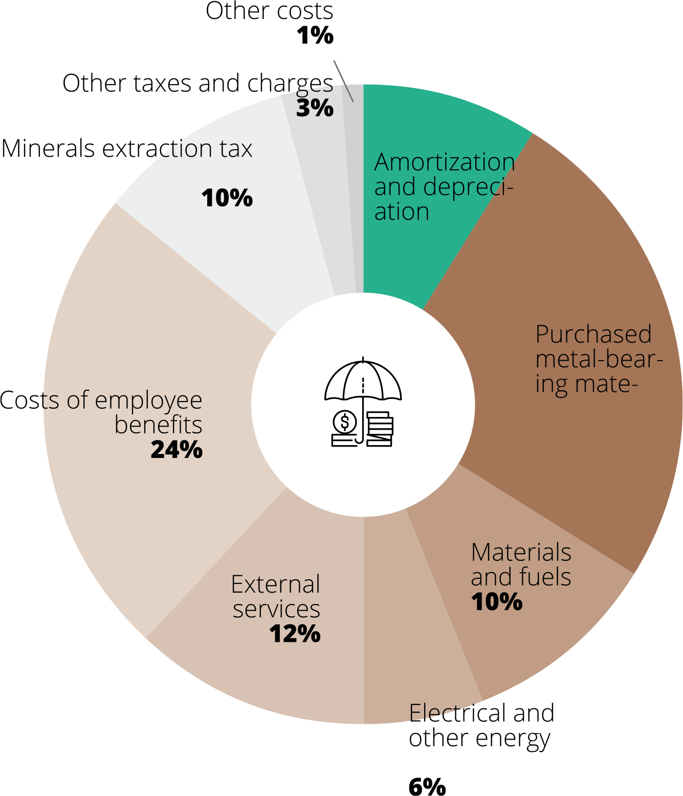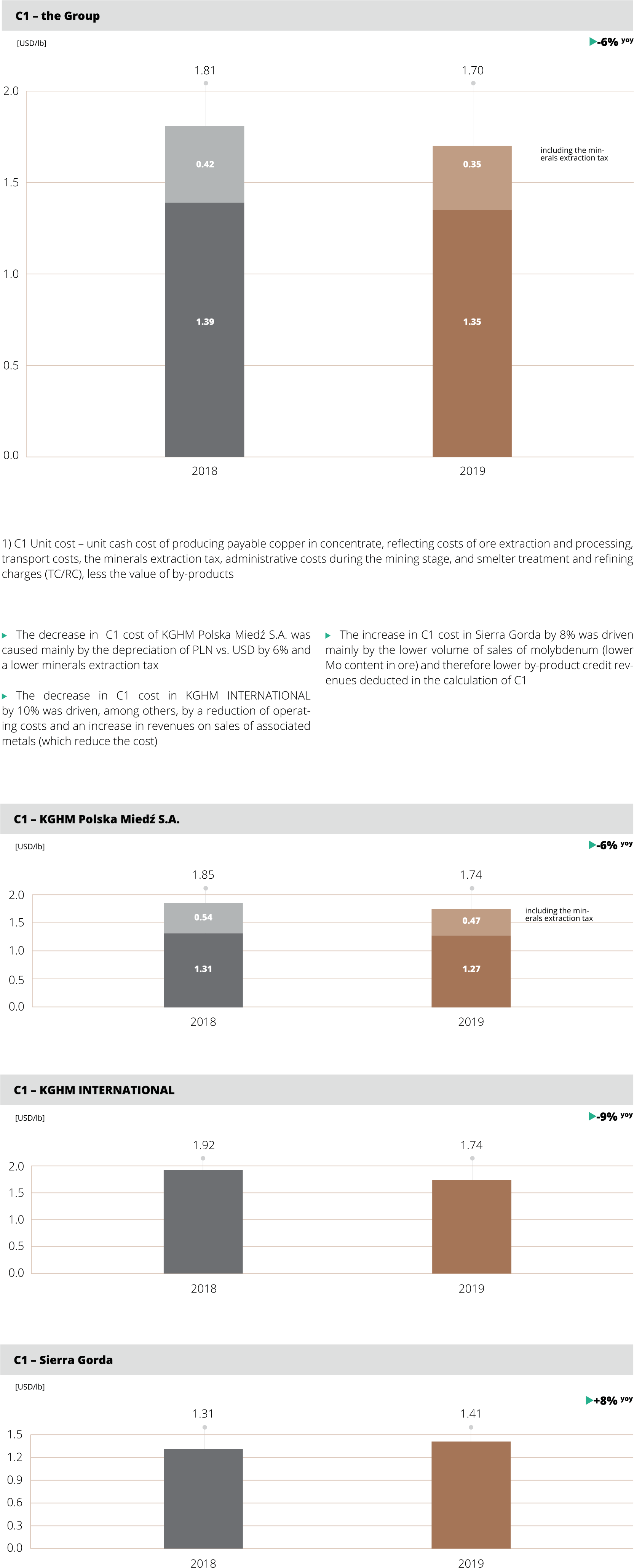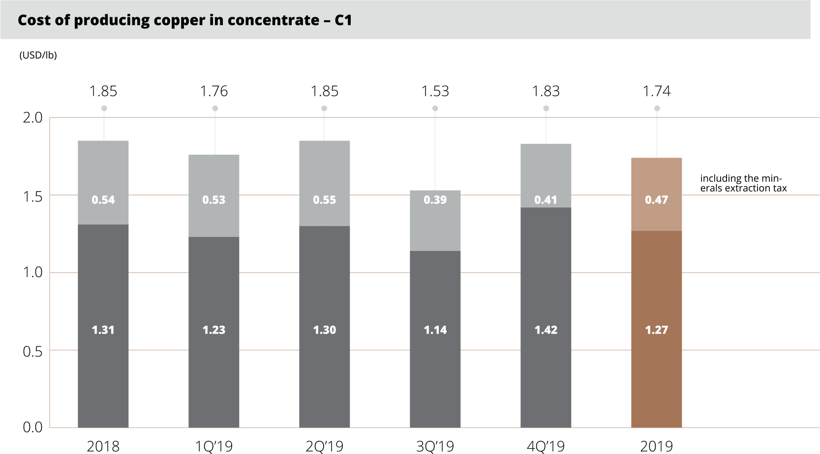 1) Sum of costs of extraction, flotation and metallurgical processing per cathode, including costs of the support function and cathode sales costs, adjusted by the value of inventories of semi-finished products and production in progress less the value of anode slimes, divided by the production volume of electrolytic copper from own concentrate