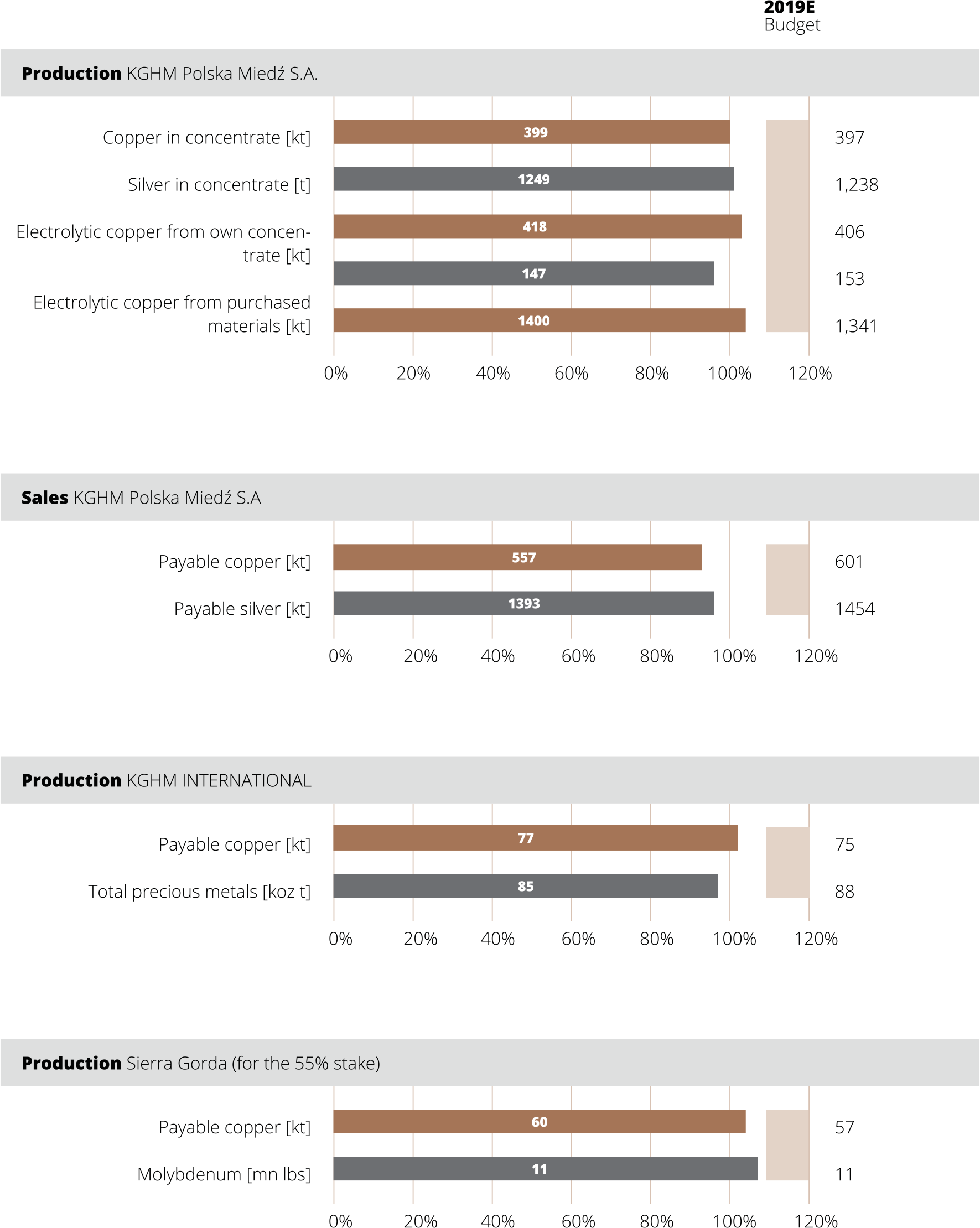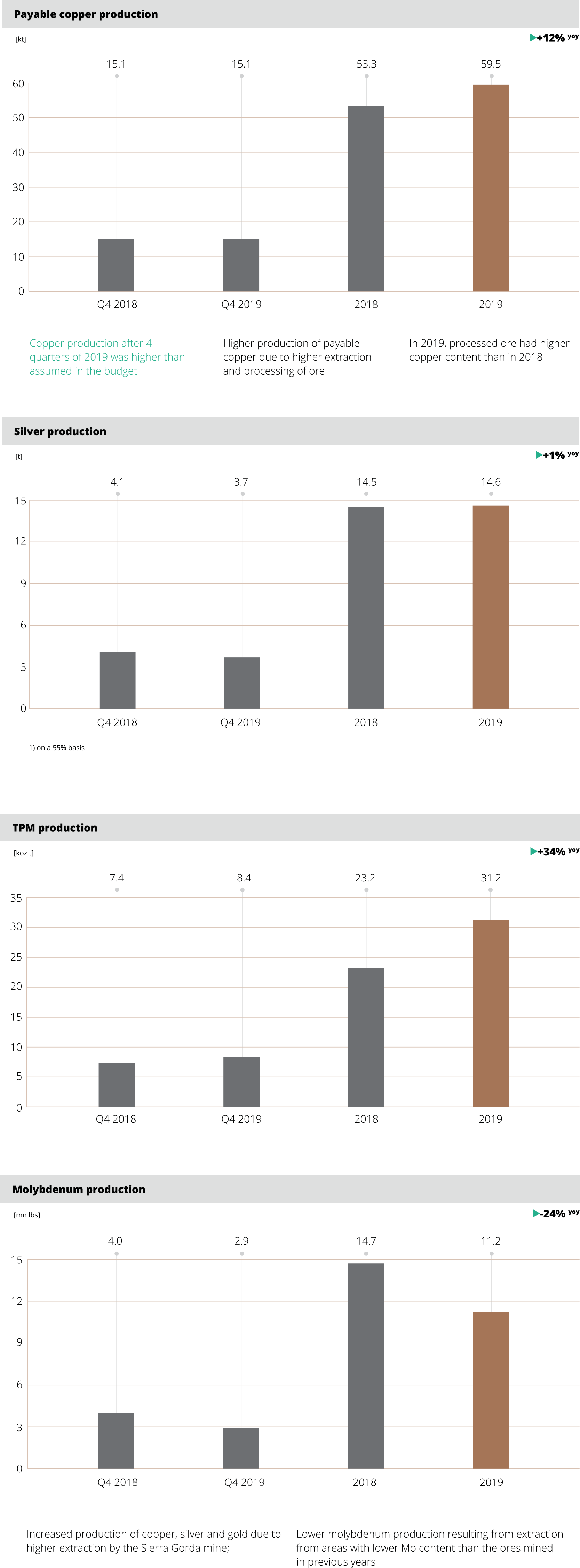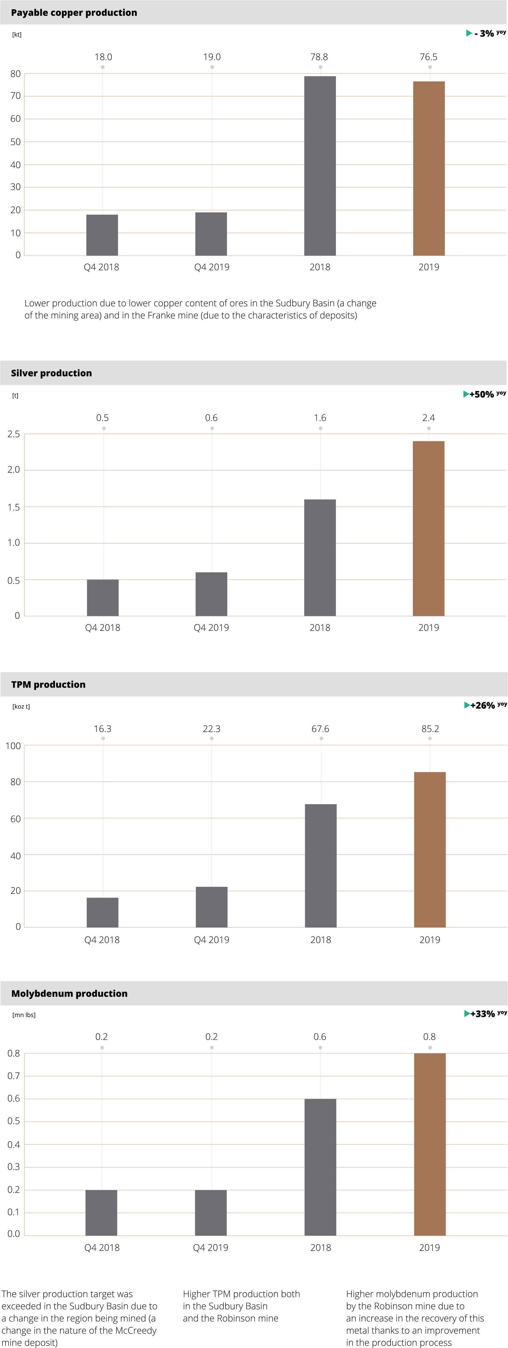 Average copper content in extracted ore amounted to 1.50% and was higher than the level achieved in 2018 due to mining in regions with a higher copper ore content. The content of silver in the ore extracted was at a similar level of 48.7 g/tonne.