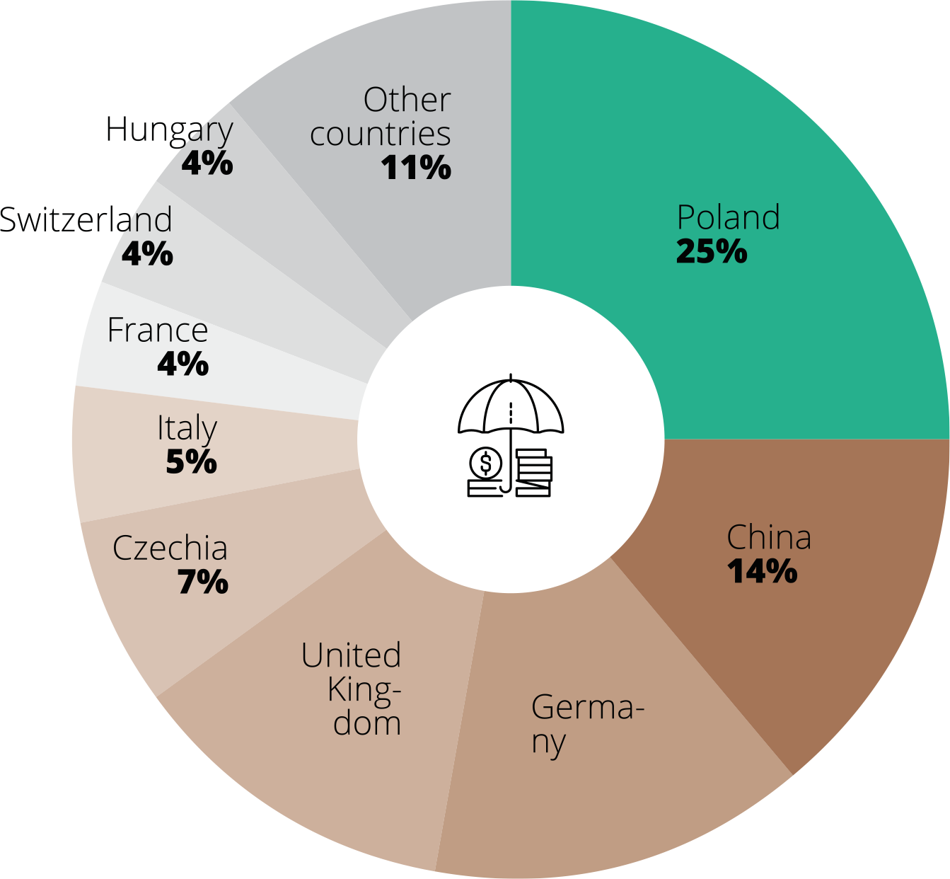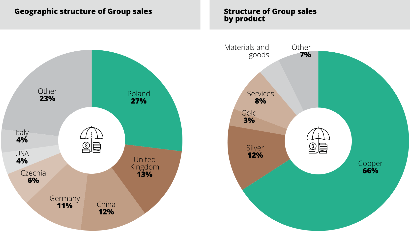 The geographic and product structure of the consolidated sales revenue of the Group are presented in the following charts. In accordance with the adopted principle of consolidation by the equity method, sales revenue do not include revenues of the segment Sierra Gorda S.C.M.