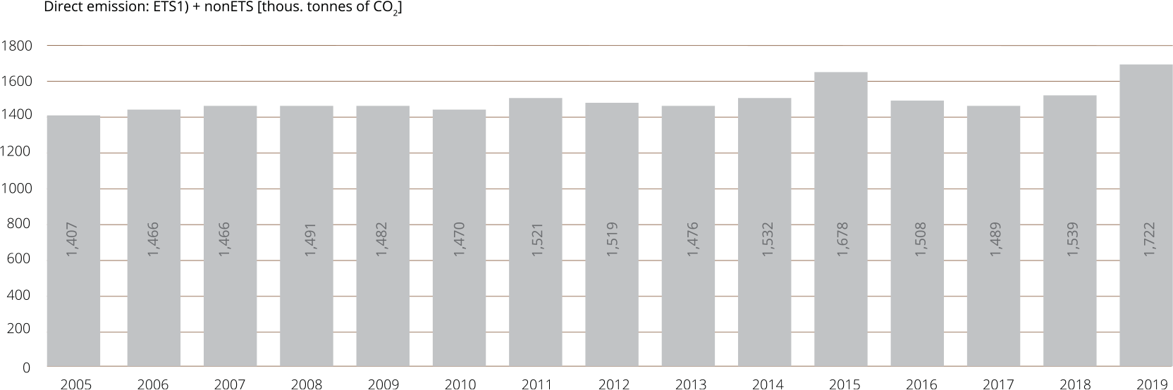 In 2019, emissions in the previous year (2018) in the amount of 1,110 thousand tonnes of CO2 were settled by freely-acquired rights (around 930 thousand tonnes of CO2 for 2018 and from reserves) supplemented by purchases of rights (EUAs or European Emission Allowances and CERs - certified emission reduction).