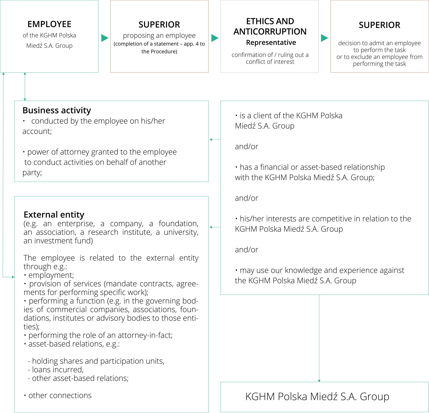 The only exception is giving and accepting business gifts in line with the local norms and cultural customs, provided that the giving and accepting of gifts cannot lead to a situation in which such behaviour could be considered as an attempt to exert pressure or persuade the recipient to act against their duties. Detailed rules pertaining to giving and acceptance of customary business gifts have been defined as an instruction under the Corruption Threat Prevention Procedure. Employees are required to avoid any actions or decisions in a situation of a conflict of interests. Particular control under the Policy is over business procurement transactions, including an option of a third party audit, in order to ensure that such transactions meet the highest standards of ethical and transparent business operations. The KGHM Polska Miedź S.A. Group Entities and their Employees may be held accountable for actions of persons or entities acting on their behalf or for them.
