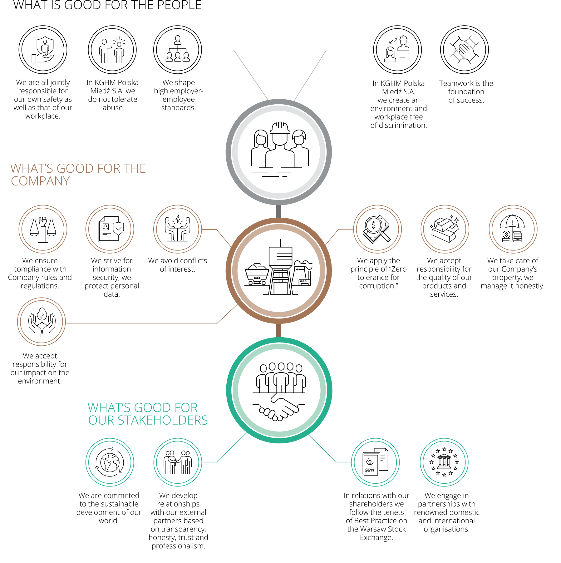 Miedź S.A. Group. There are supporting acts regulating the areas of: prevention of corruption, prevention of conflict of interests, security and transparency of procurement processes, verification of external counterparties and prevention of employee rights violations, including discrimination and abuse. The KGHM Group’s Code of Ethics is a collection of rules applicable to the employees of the Parent Entity, the KGHM Group and cooperating entities. It is one of the pillars of KGHM’s organisational culture, which is deeply rooted in the mining and metallurgical traditions. They constitute the genetic code of our community, building its professional identity. The KGHM Group’s Code of Ethics aims to ensure that the employees follow the highest standards based on the adopted values. The status of a global leader and international corporation obligates us to keep the highest business ethics standards. It is also related to the challenges resulting from the richness of national cultures within which we operate.